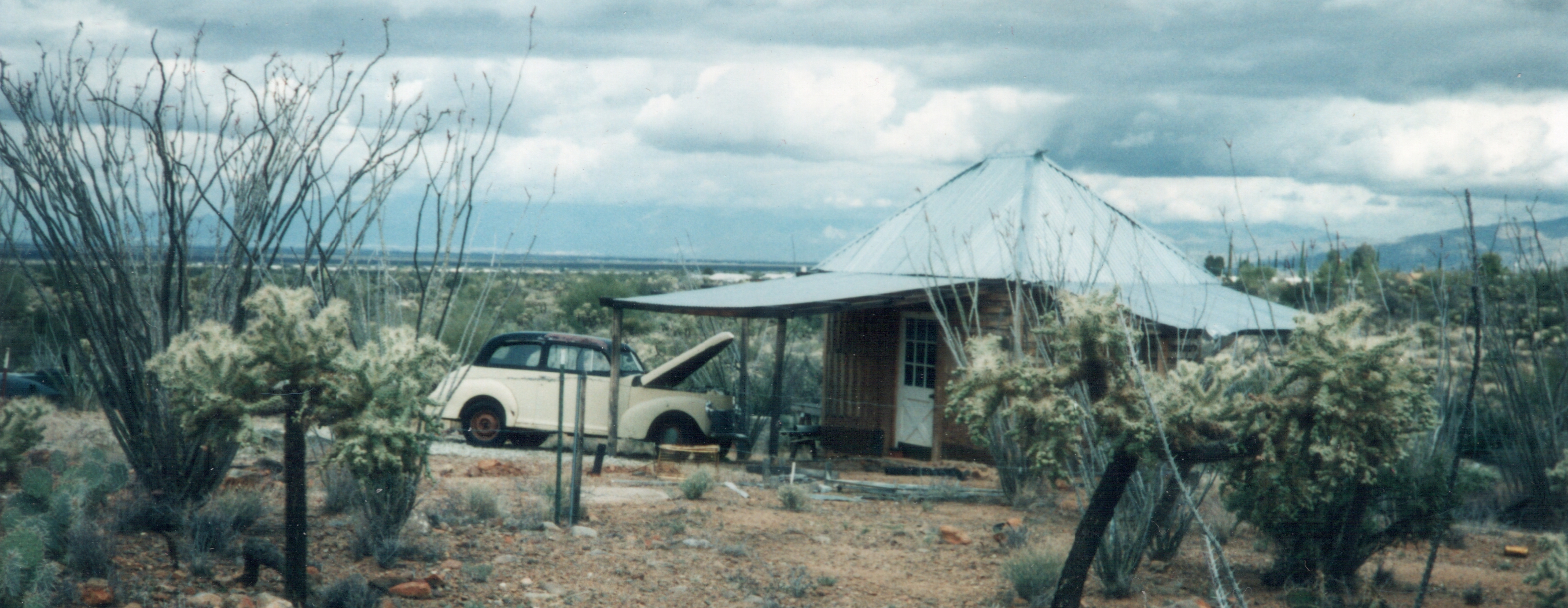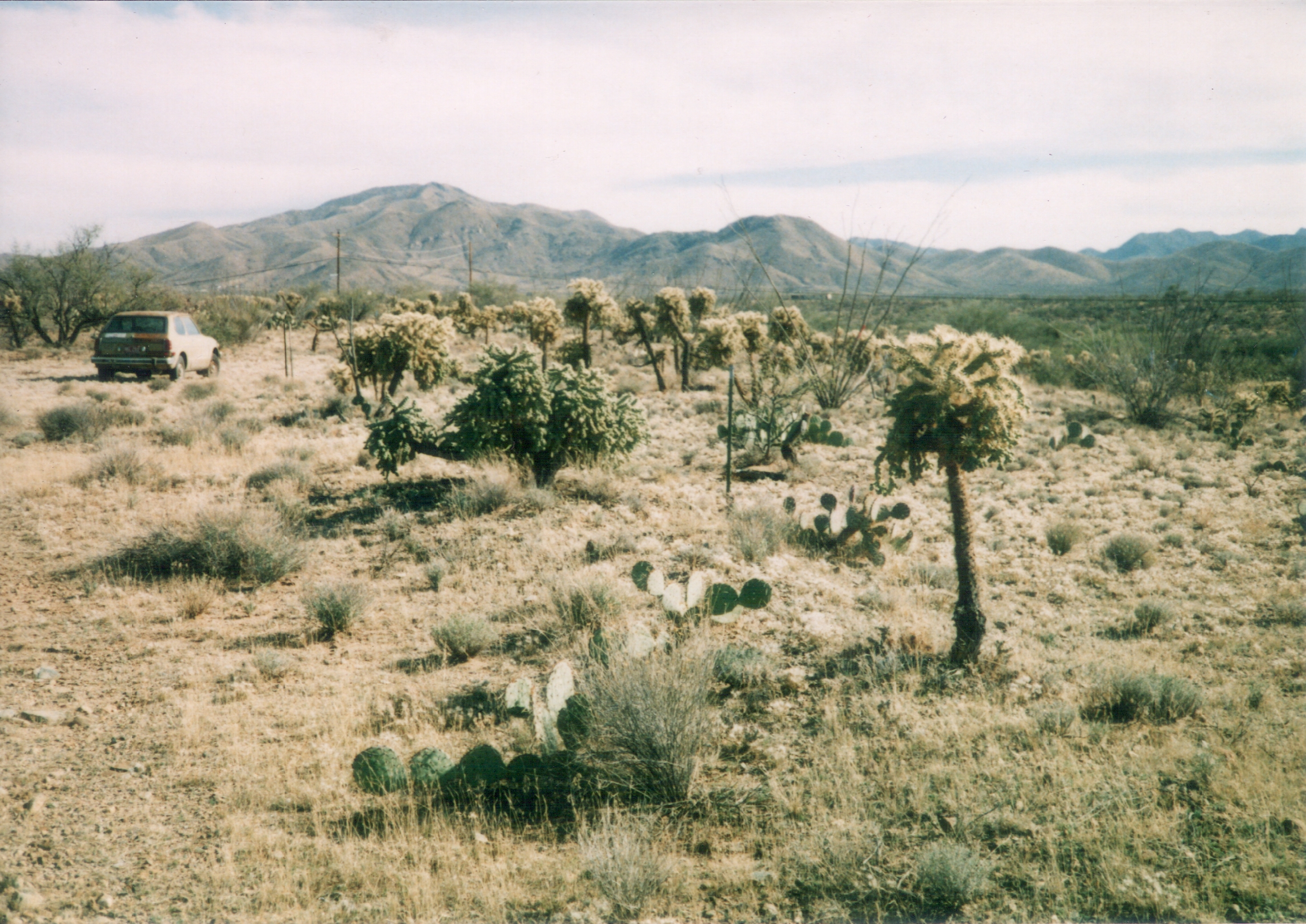 Looking south at Santa Rita Mountains, March 2004, on Hershel Hobbs Place. Note the T-posts at the corners where I had five lots surveyed. I had plans to develop these lots and sell them to hippies. 1977 Honda Civic.