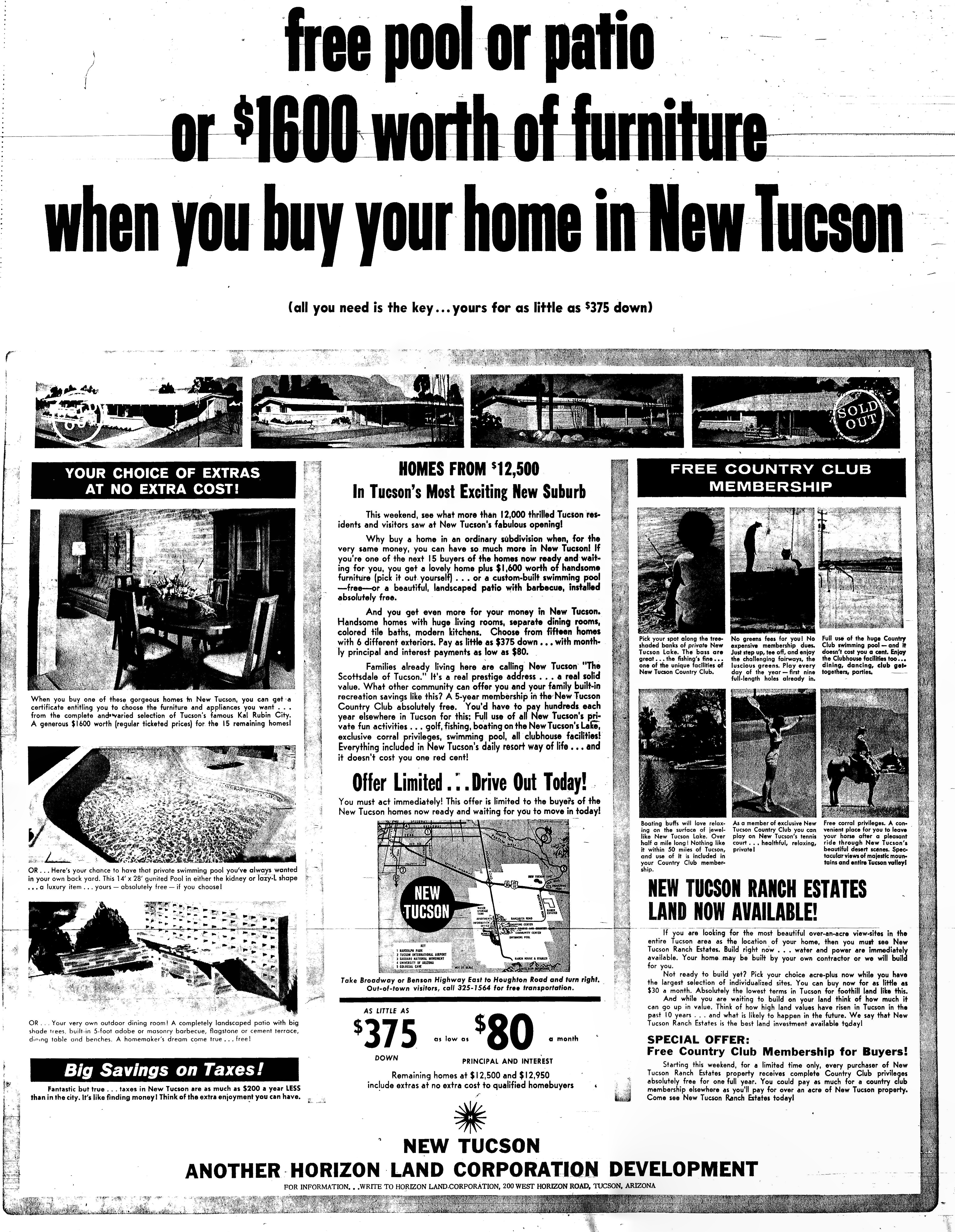 I’ve been studying the Federal Trade Commission Complaint against Horizon Corporation, which was responsible for developing New Tucson, key words to search in the 500-page document is “improvement.” It appears from the Complaint that Horizon deceived buyers into thinking there would be improvements on their lots. Pima County no longer approves a subdivision without utilities and roads.