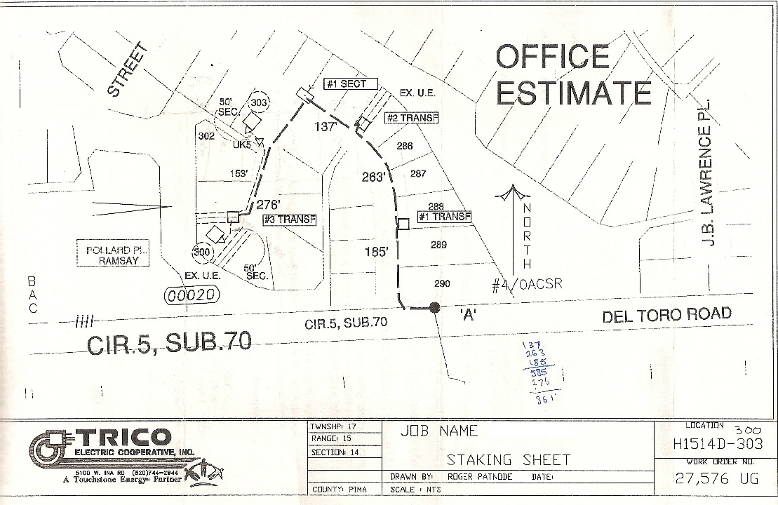 At the 2010 annual HOA meeting, April 29, Mr Russo said, “best case scenario is that home building [in Unit 5] could start in six months.” Next meeting, 28 April 2011, we were told, “there would not be any moving forward with development in 2011 but possibly in 2012.” 2012 meeting we were told SW corner of Unit 5 will be developed and an assessment of $10k would be imposed for the streets. In January 2013, Ms Baranow called Pima County Development Services to ask about building plans in Unit 5. The person reviewing the plans said no permit would be issued for at least six-months to a year, there are also problems with the electric, which has been underground for over six years. (Lots in the SW corner are now finished and ready to build in Unit 5.)